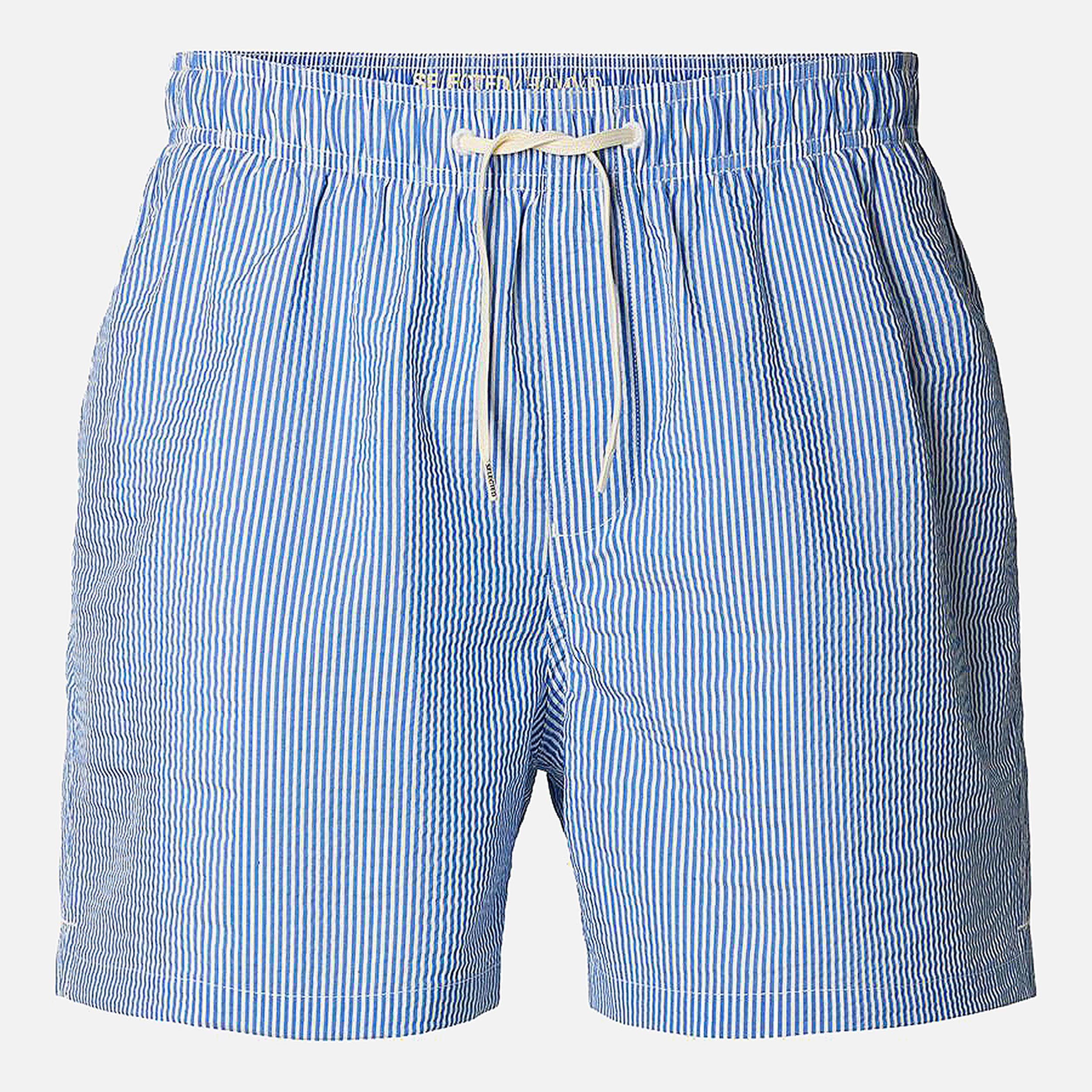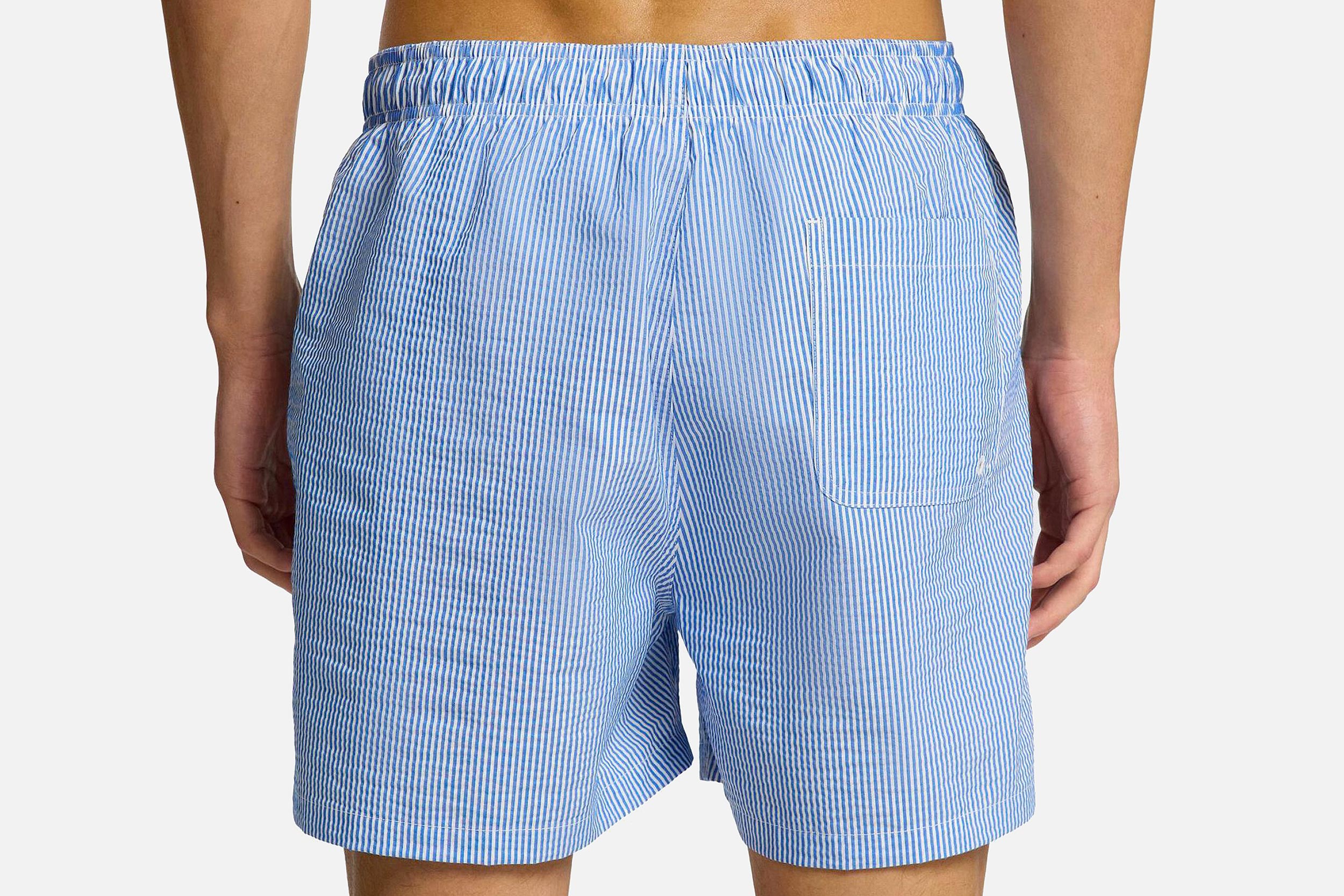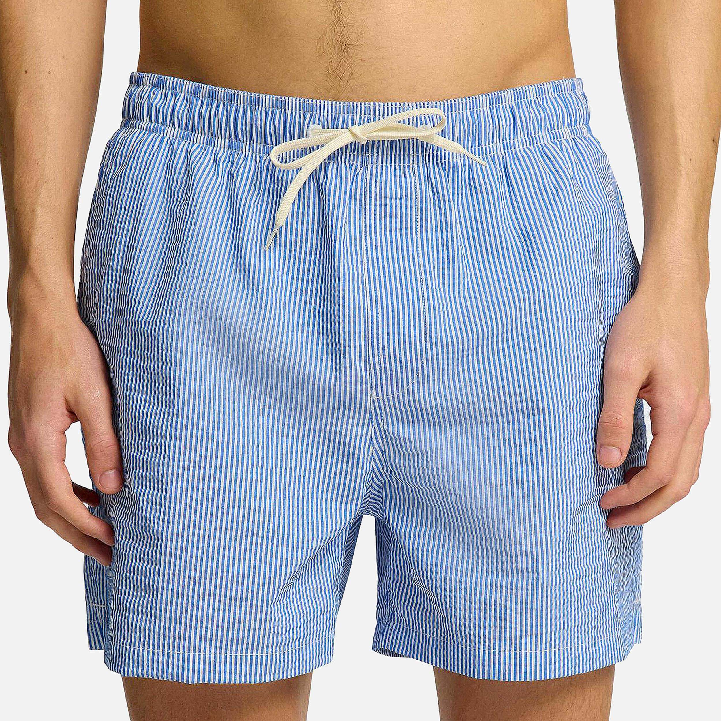 Des vacances au bord de la piscine nécessitent un nouveau short de bain. Il est doté d'une taille moyenne confortable et d'un cordon de serrage. Il possède même des poches pour ranger vos objets de valeur lorsque vous vous prélassez au soleil. Il est fabriqué dans une matière seersucker texturée et possède également une doublure en maille respirante. Pour un déjeuner tardif, mettez un t-shirt oversize et enfilez vos sandales. - Taille mi-haute - Fermeture à cordon réglable - Fausse braguette - Poches latérales - Poche arrière unique - Doublure en maille respirante - Tissu seersucker - Motif à rayures - Coupe classique