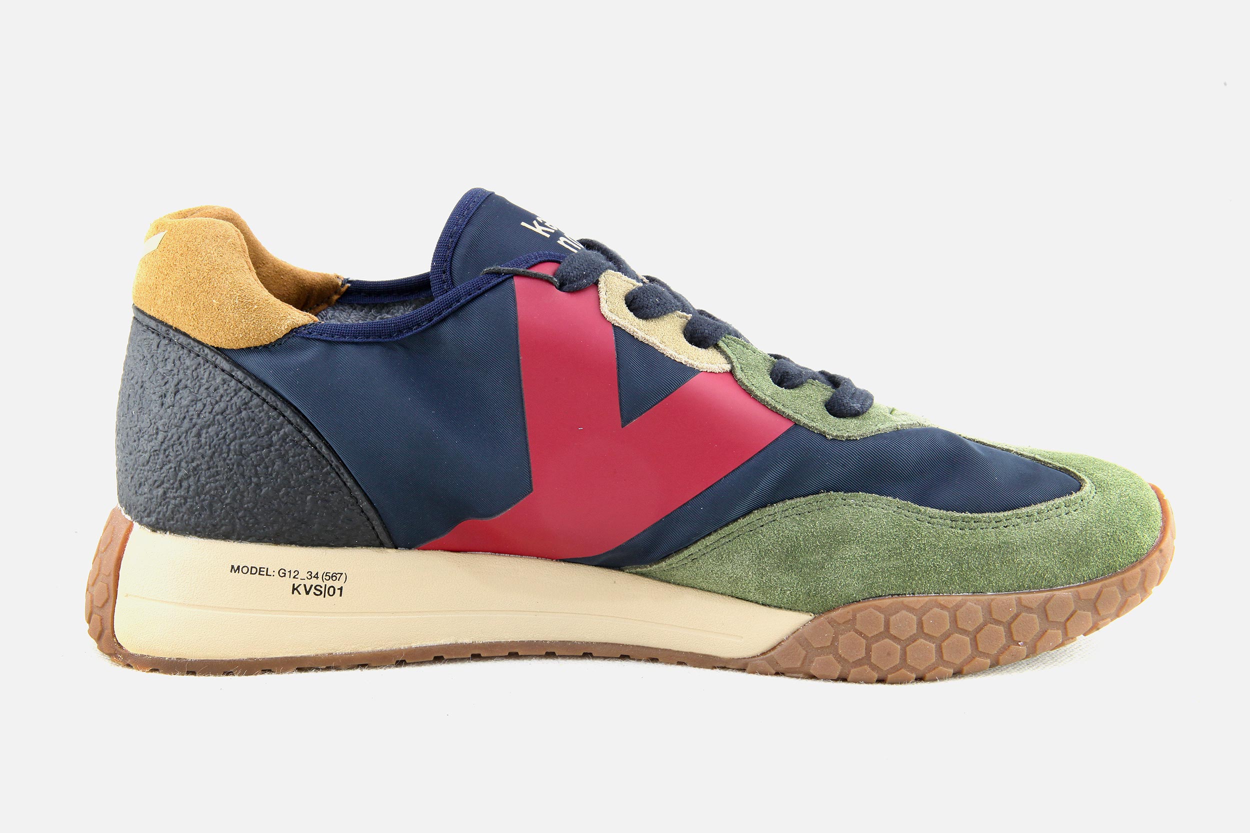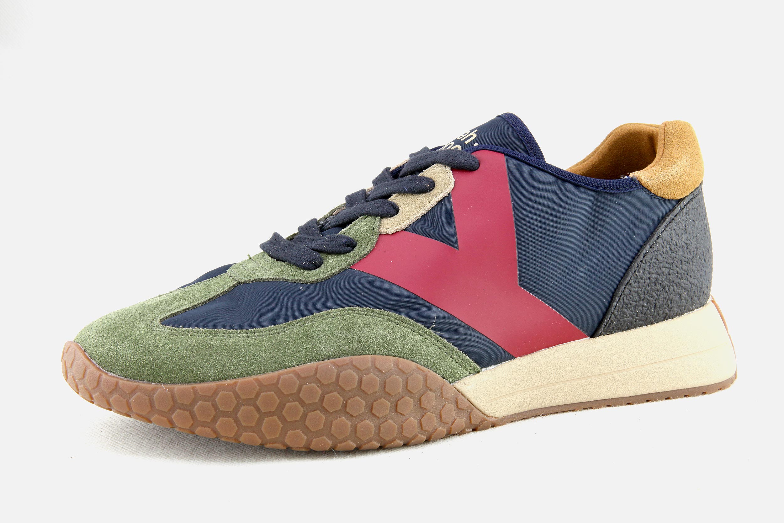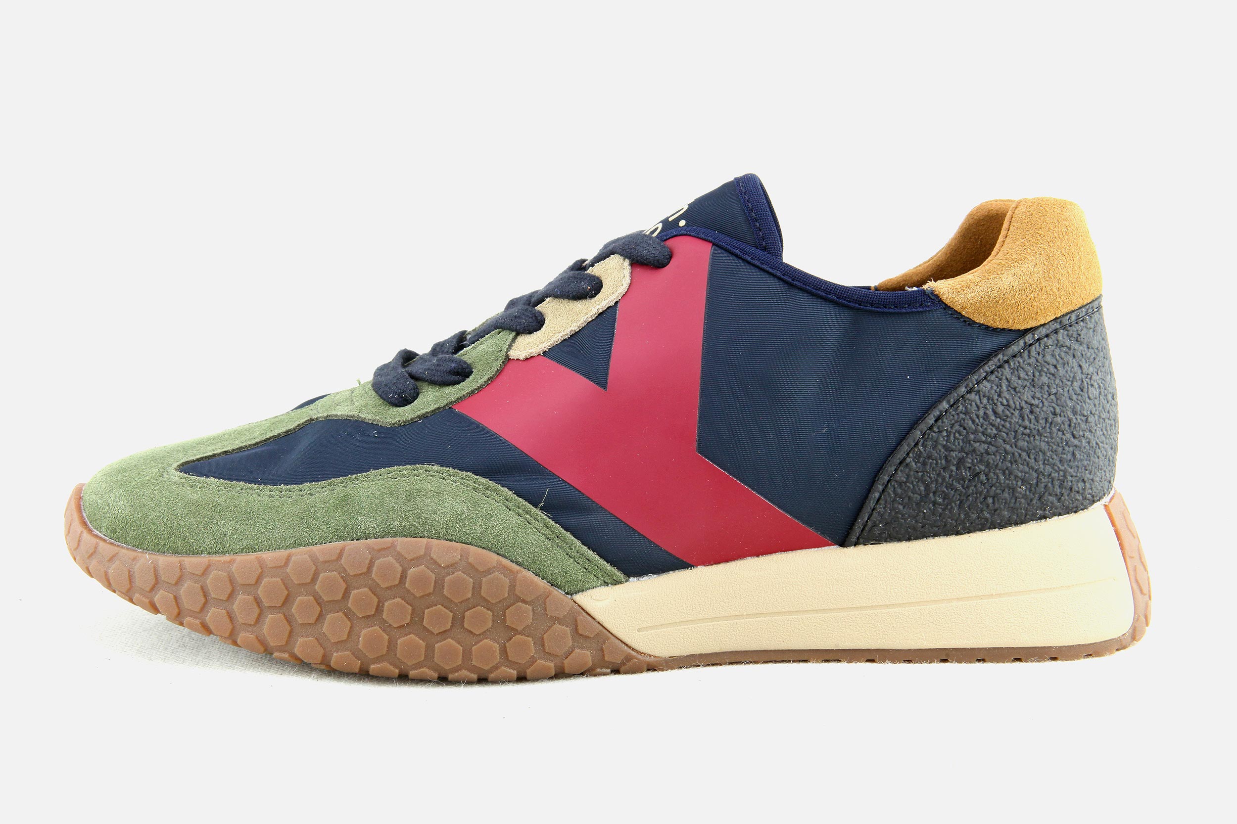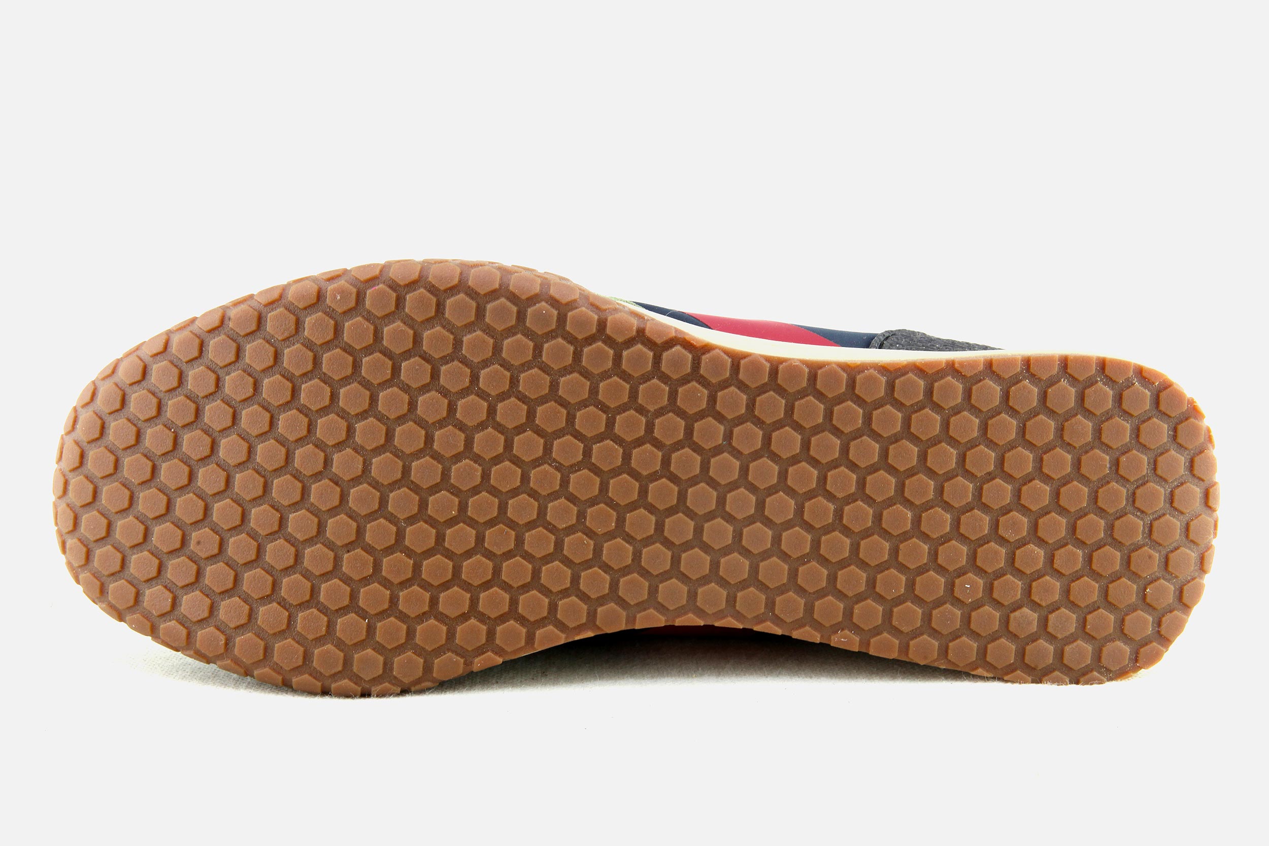 Le dessus des chaussures est composé de matériaux légers (cuir, daim - nubuck, tissu moumoute l’hiver et toile l’été), la doublure est en coton éponge et la semelle intérieure est amortissante. Notez la semelle en relief avec son motif nid d’abeille qui remonte sur la pointe, les flancs et l’arrière du pied, hommage rétro aux chaussures de sport italiennes.