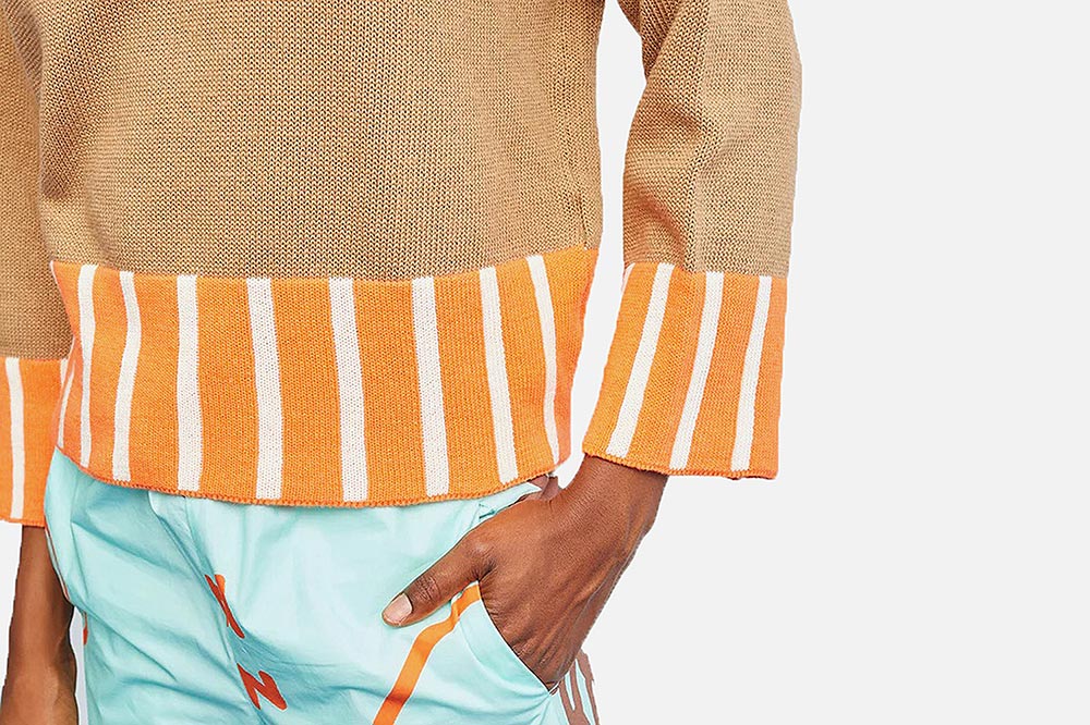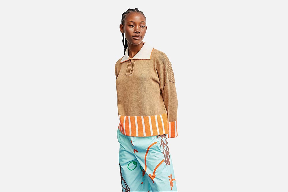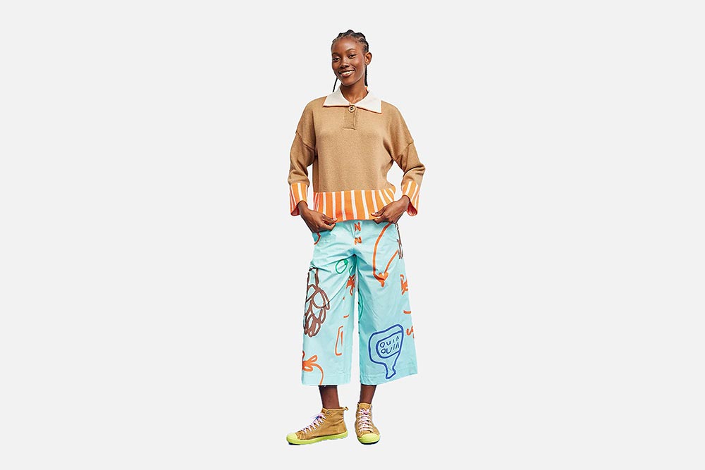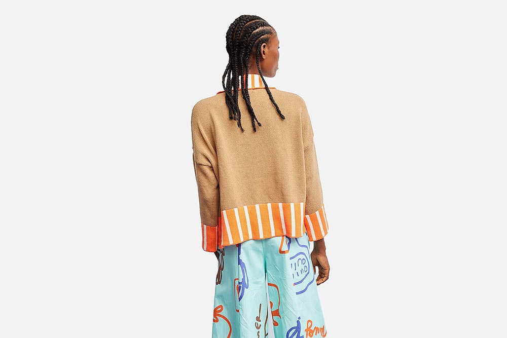 Elle propose de nombreuses pièces différentes (tops, gilets, polos, cardigans, pantalons, mailles…) aux coupes aussi originales que créatives, couplées de détails féminins très amusants. Ses couleurs sont toniques, ses imprimés modernes et rétro, son univers optimiste et agréable.