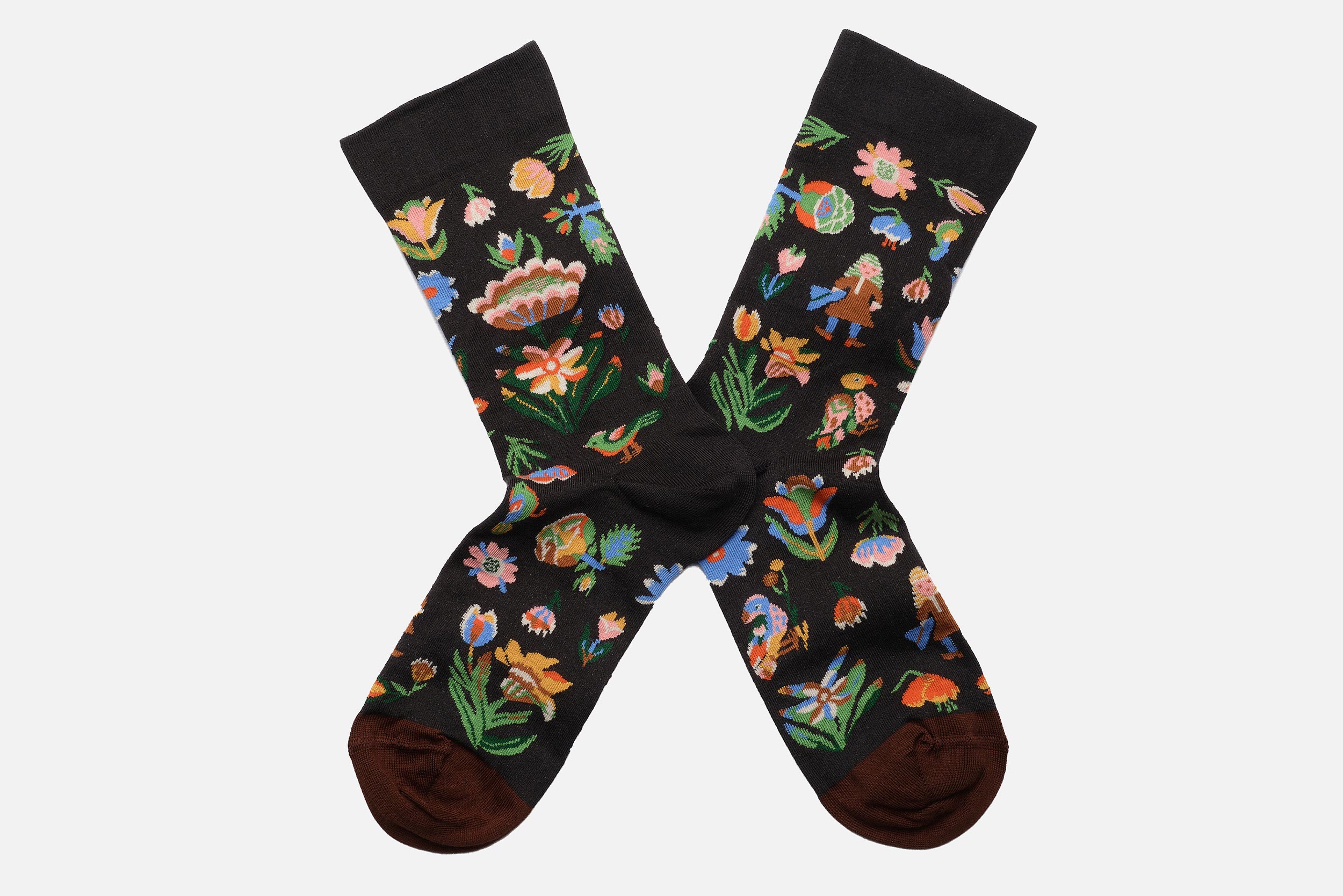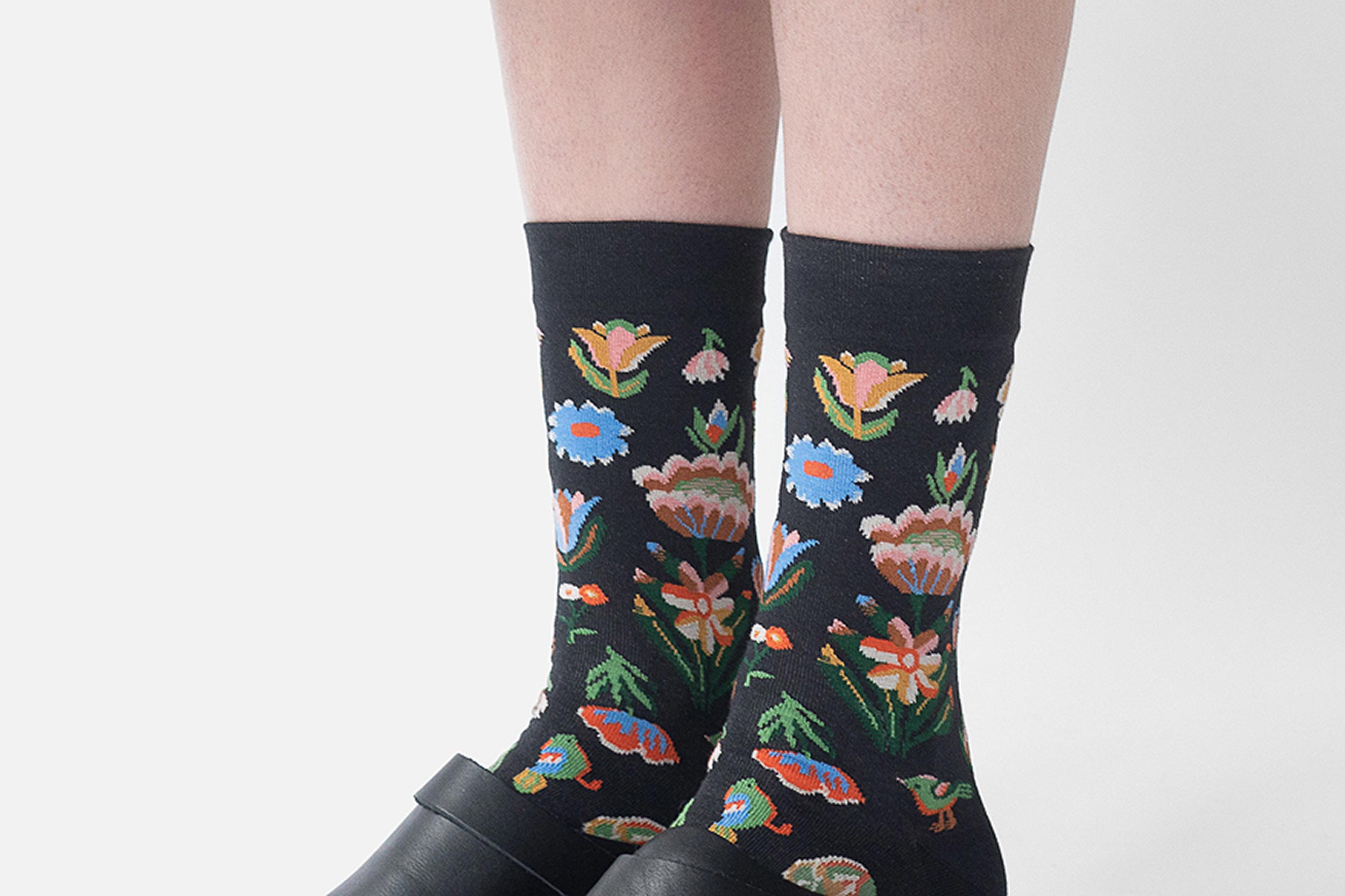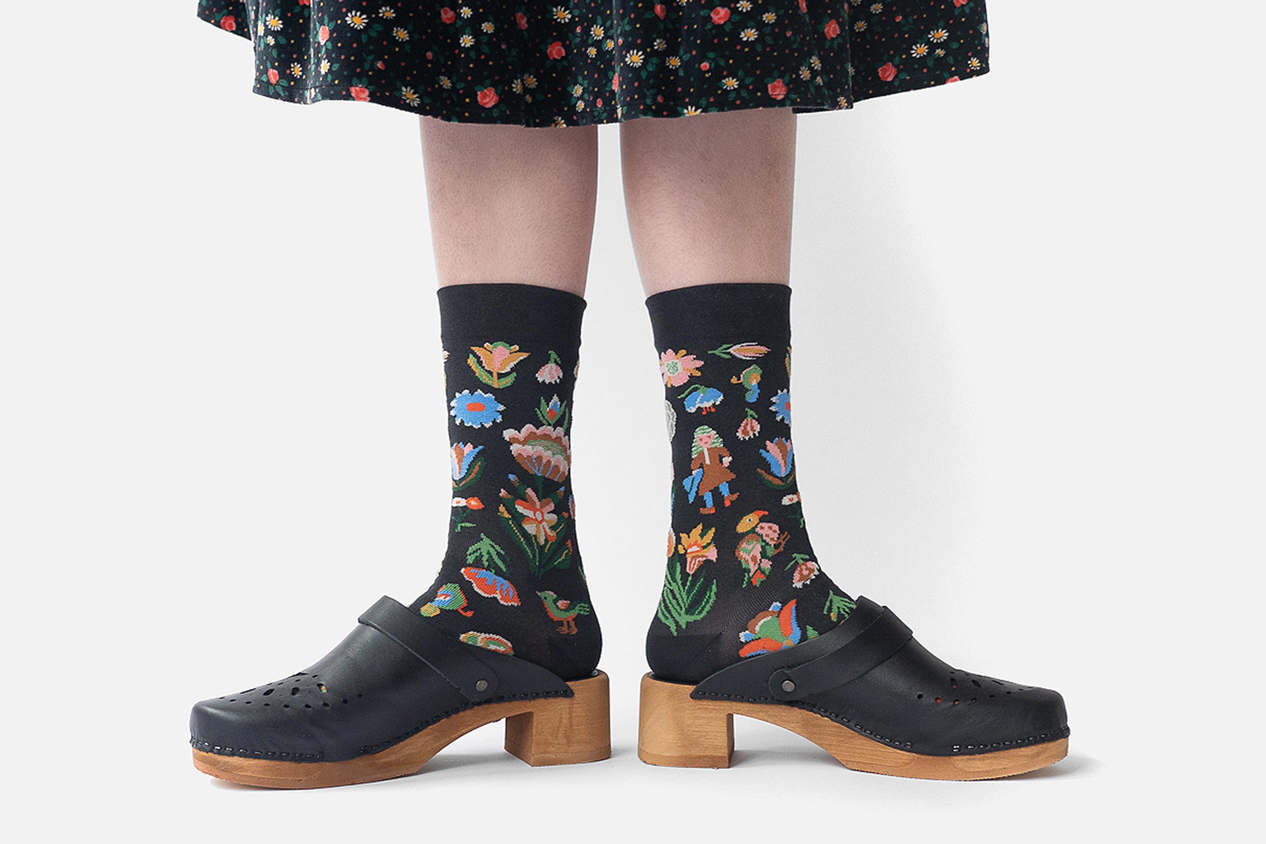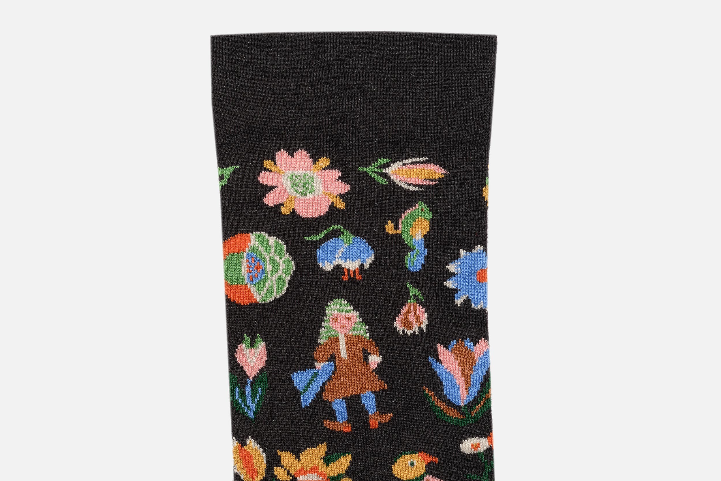 Every season, Bonne Maison releases 3 lines of orginal and arty socks, 3 different stories full of colorful patterns that blend among peculiar recuring characters: blond women, eccentric clowns, and animals, living in rocky mountains, or surrealists landscapes, full of wondeful flowers: peonies, carnations, irises, daisies, poppies…